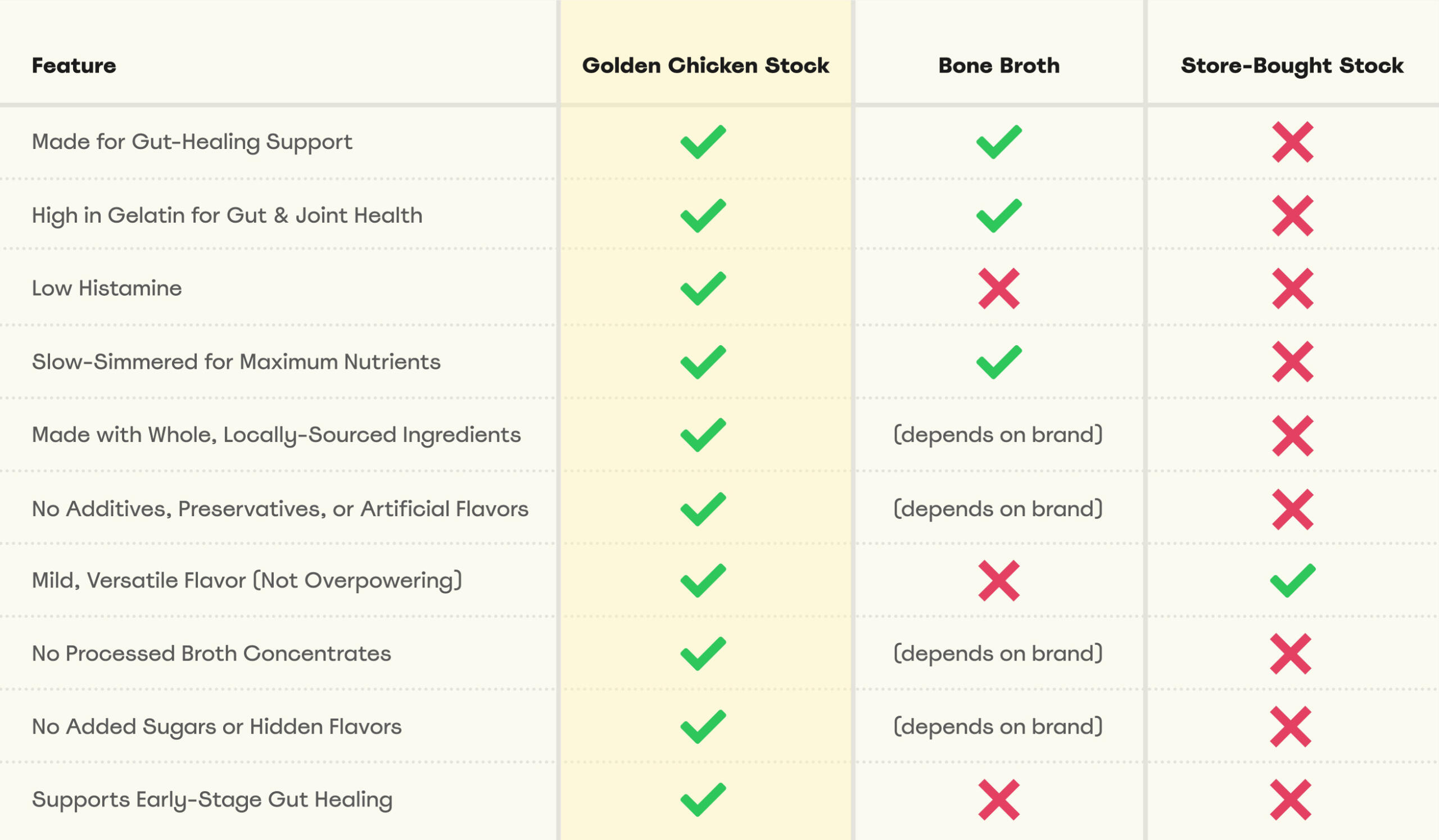 More than just broth, Golden Chicken Stock is carefully crafted to provide gentle gut support for those in the early stages of healing. Made with locally sourced, low-histamine ingredients and simmered to extract nourishing gelatin, this stock features chicken feet, organic turmeric, fresh ginger, zucchini, sea salt, and marshmallow root for a light, comforting flavor that isn’t overpowering.Sip it warm, use it as a base for soups and stews, or incorporate it into your favorite recipes for an easy way to nourish your body. However you enjoy it, Golden Chicken Stock makes gut-healing support simple and accessible—one sip at a time.